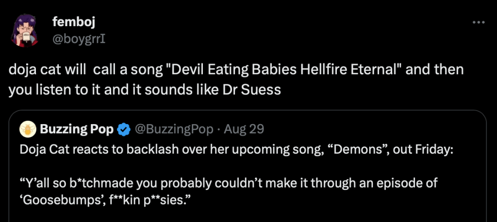 This tweet captures exactly how I feel about the current state of Doja Cat’s music and persona. Self conscious and performative “edginess” seemingly an attempt to distract from the simplistic, radio-friendly rhyme schemes.